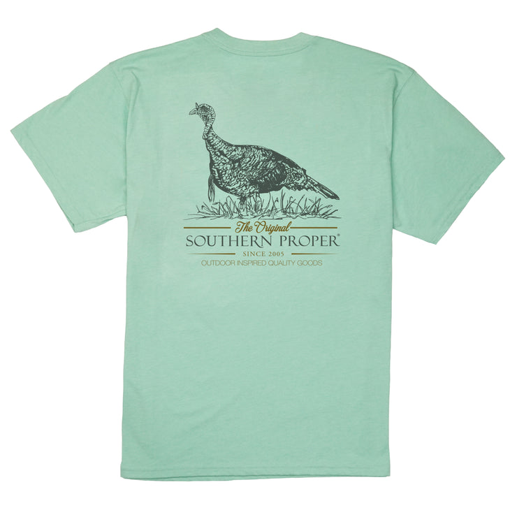 Crew Neck Tee. Printed front pocket and Hand Drawn Wild Turkey print graphic on the back. 100% Peruvian Cotton.